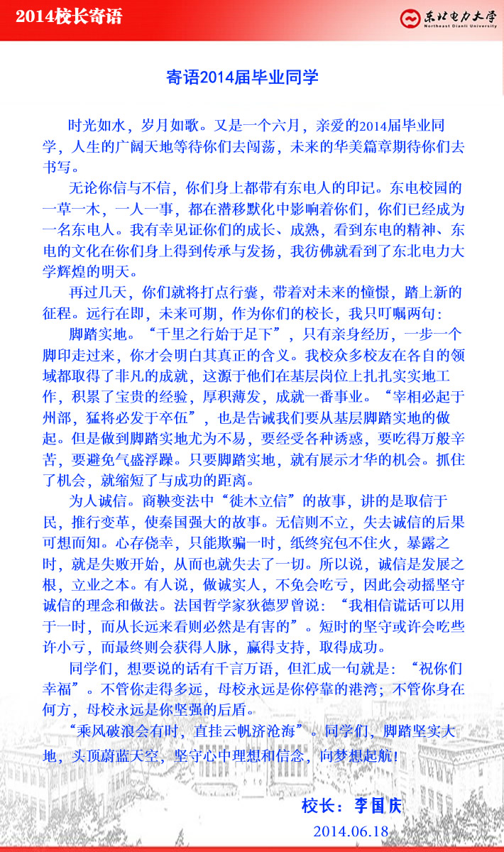 校长李国庆致2014届毕业同学