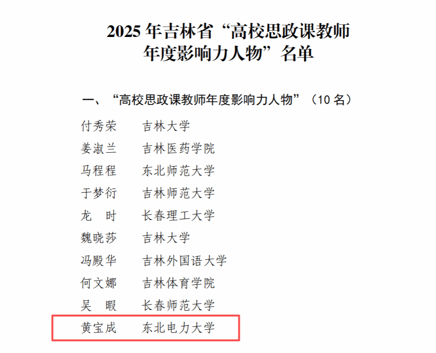 近日,吉林省教育厅公布2025年吉林省“高校思政课教师年度影响力人物”推选展示活动评选结果,我校马克思主义学院教师黄宝成获评2025年吉林省“高校思政课教师年度影响力人物”,陶美庆入选2025年吉林省“高校思政课教师年度影响力人物提名”。