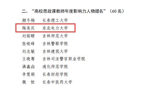 “高校思政课教师年度影响力人物”推选活动旨在贯彻落实习近平总书记在全国教育大会上的重要讲话以及关于学校思政课建设的重要指示精神,着力建设一支政治强、情怀深、思维新、视野广、自律严、人格正的思政课教师队伍。2025年吉林省“高校思政课教师年度影响力人物”评选活动,经学校推荐、专家评审,共评选出吉林省“高校思政课教师年度影响力人物”10人、“高校思政课教师年度影响力人物提名”60人。